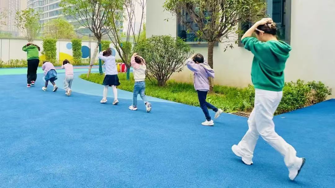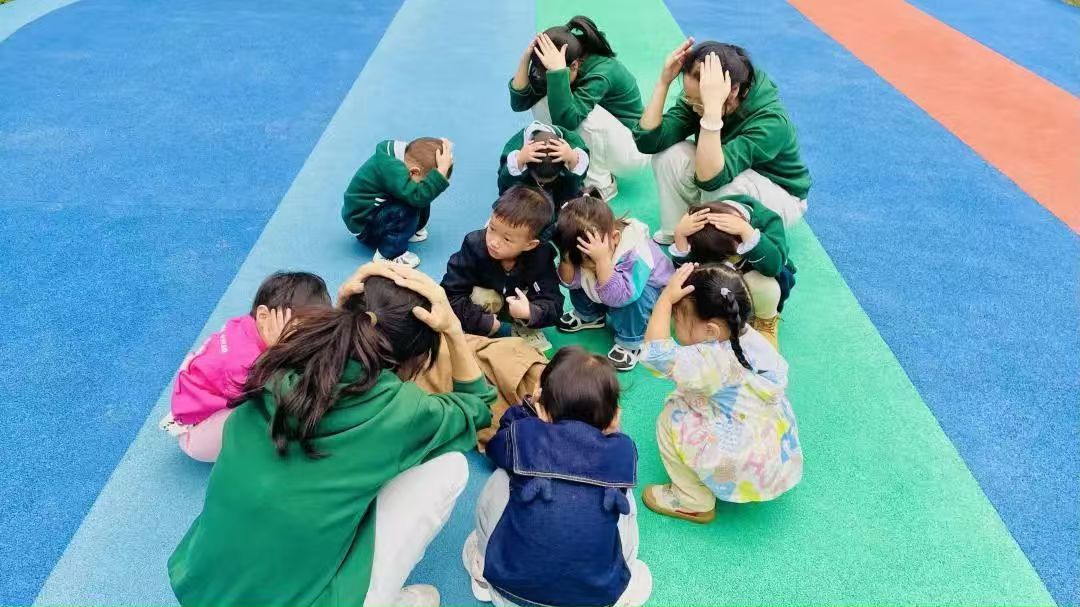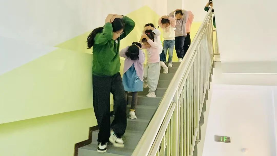 第二次警报声响起,幼儿在教师的带领下弯腰、护头,迅速有序沿着指定疏散路线撤离,教师们按照各自职责保护幼儿,确保每位幼儿的安全。