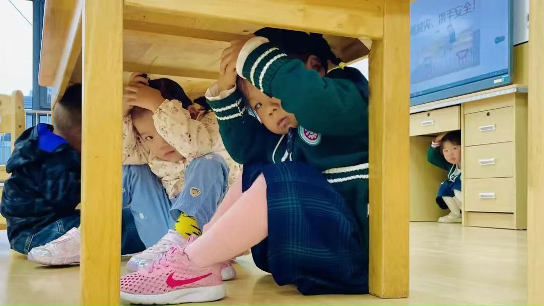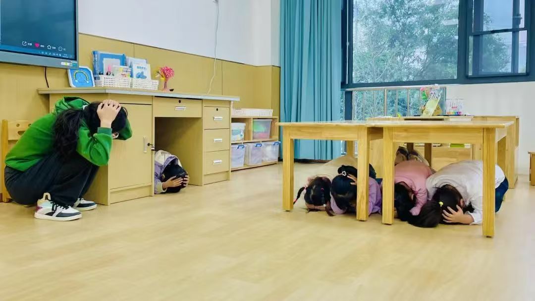 第一次警报声响起,防震应急疏散演练正式开始。全园师幼立即停止活动,以最快速度躲避到安全区域,迅速抱头、躲在桌下,尽量蜷曲身体,降低身体重心,尽可能保护头部和眼睛,并远离窗户。