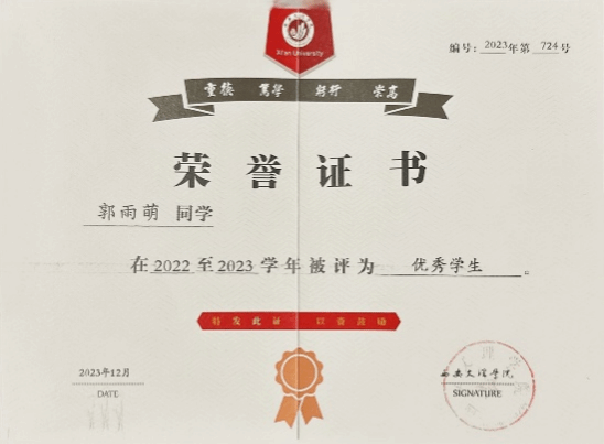 自踏入大公司园的那一刻起,她便以勤勉的态度投身于学业与实践之中。她不仅在专业学习上精益求精,成绩斐然,更在各类比赛中屡获佳绩,用实力诠释了“奋斗的青春最美丽”。