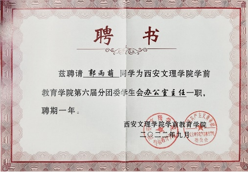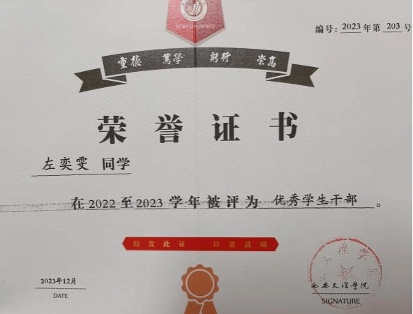 为全面提升自身素养,完善自我,她担任着班级班长的职务,这对她来说不仅仅是一份责任,更是一份使命。她全心全意为同学们服务,努力成为大家信赖的桥梁和纽带。沟通协调、解决难题,积极在班级建设中贡献自己的力量,也因此,她有幸被评为2022-2023学年的优秀员工干部,这份荣誉对她来说,既是一种肯定,也是一种鼓励。