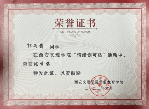 在学业方面,她立志具备幼儿教师基本专业素养,成为素养卓越的幼儿教师,因此她严格自律,自入校以来,综合考评在班级内一直居于第一同时。同时力求突破,积极参与学科竞赛,在老员工创新创业大赛中两次获得省级立项,将理论知识与实践要求相结合,为解决和分析专业现实问题贡献自己的一份力量,这些知识的积累和专业的突破都为她成长为素养卓越的幼儿教师加码,为她之后的成长积累了宝贵经验。