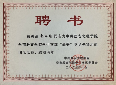 她积极投身员工会选拔,凭热情、责任心及团队协作能力成功入选。她全心投入员工会工作,不仅锻炼了领导力与团队精神,还结识了众多志趣相投的伙伴,共促校园文化繁荣。同时,作为党员先锋队成员,她深知其荣誉与责任并重,积极参与组织活动,提升政治觉悟,以身作则践行党的宗旨,坚定了为人民服务的信念。