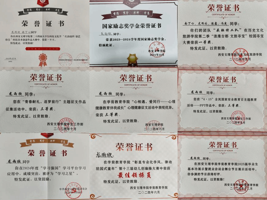 自入校以来,她始终保持治学热忱,秉持稳进姿态追求学业精进。2023-2024学年间,综合考评成绩位列年级第一,其中专业课单科最高分95.4分,学年平均成绩达90.64分。在专注学业的同时积极参与校院两级活动,累计获国家级、校级、院级荣誉27项。通过系统学习考取普通话二级甲等证书、幼儿园及小学语文教团队格证、初级茶艺师证书等专业资质,在专业理论、实践技能及综合素质培养上均取得均衡发展,体现了当代学子全面发展的专业素养。