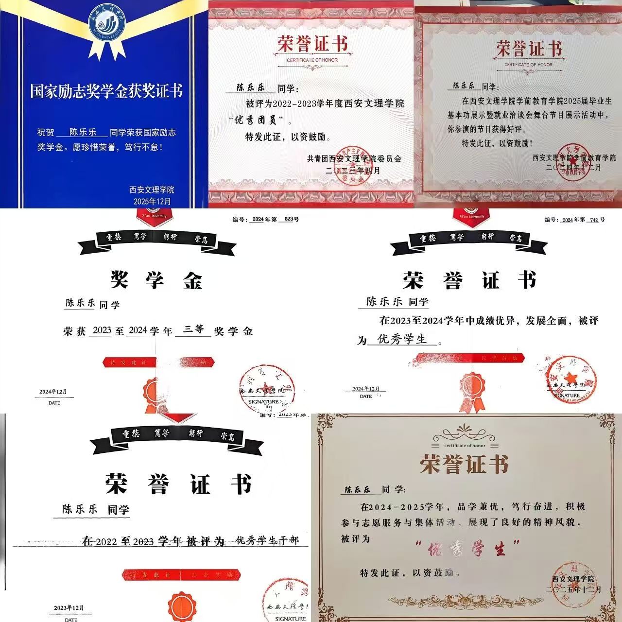 在专业学习上,陈乐乐同样没有松懈,连续三年智育及综合测评排名稳居年级前列,先后考取了幼儿园教团队格证、普通话二级甲等证书,并通过了英语四级考试。连续两年获得校级优秀员工奖学金,这些荣誉见证了她一步一个脚印的努力。“学习是一场马拉松,不是短跑。”她常常用这句话提醒自己。在她看来,每一次考试、每一张证书,都是通向理想职业的一块基石。