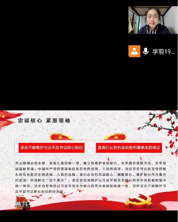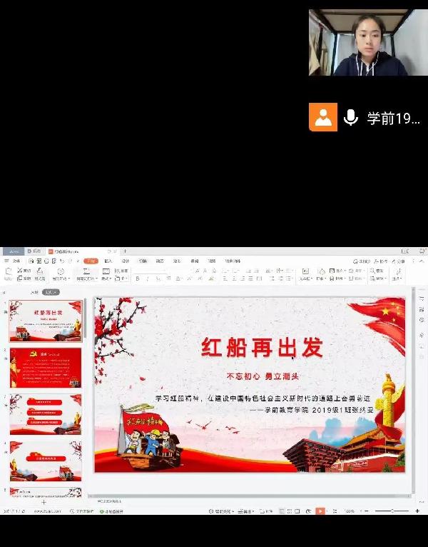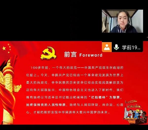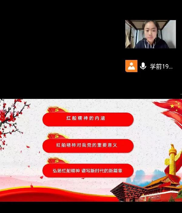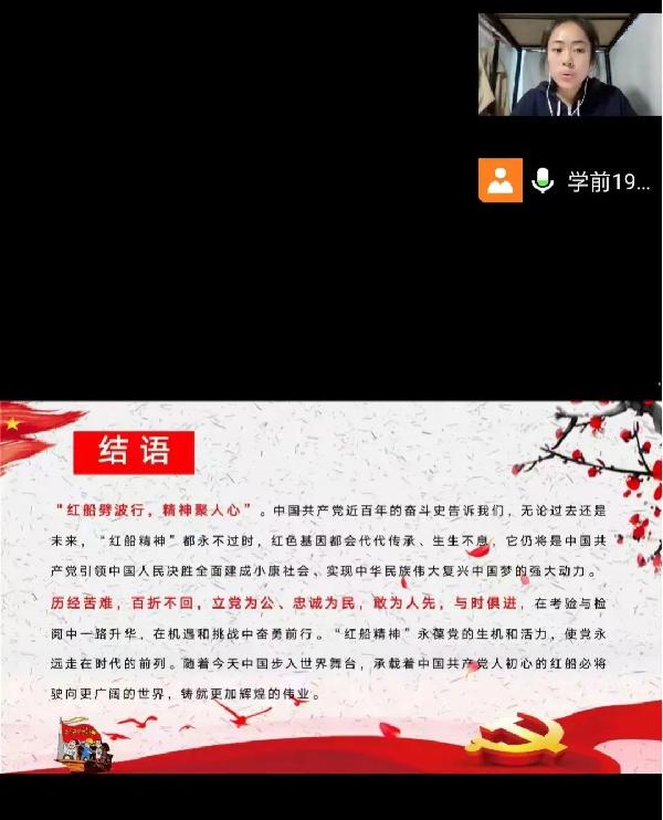 张纳雯同学与大家一起学习了红船精神的内涵,向大家介绍了什么是红船精神,红船精神是开天辟地、敢为人先的首创精神;红船精神是坚定理想、百折不挠的奋斗精神;红船精神是立党为公、忠诚为民的奉献精神。张纳雯同学让大家了解到红船精神的深刻内涵,更加深刻的明白红船精神是中国革命精神之源;红船精神是党的先进性。