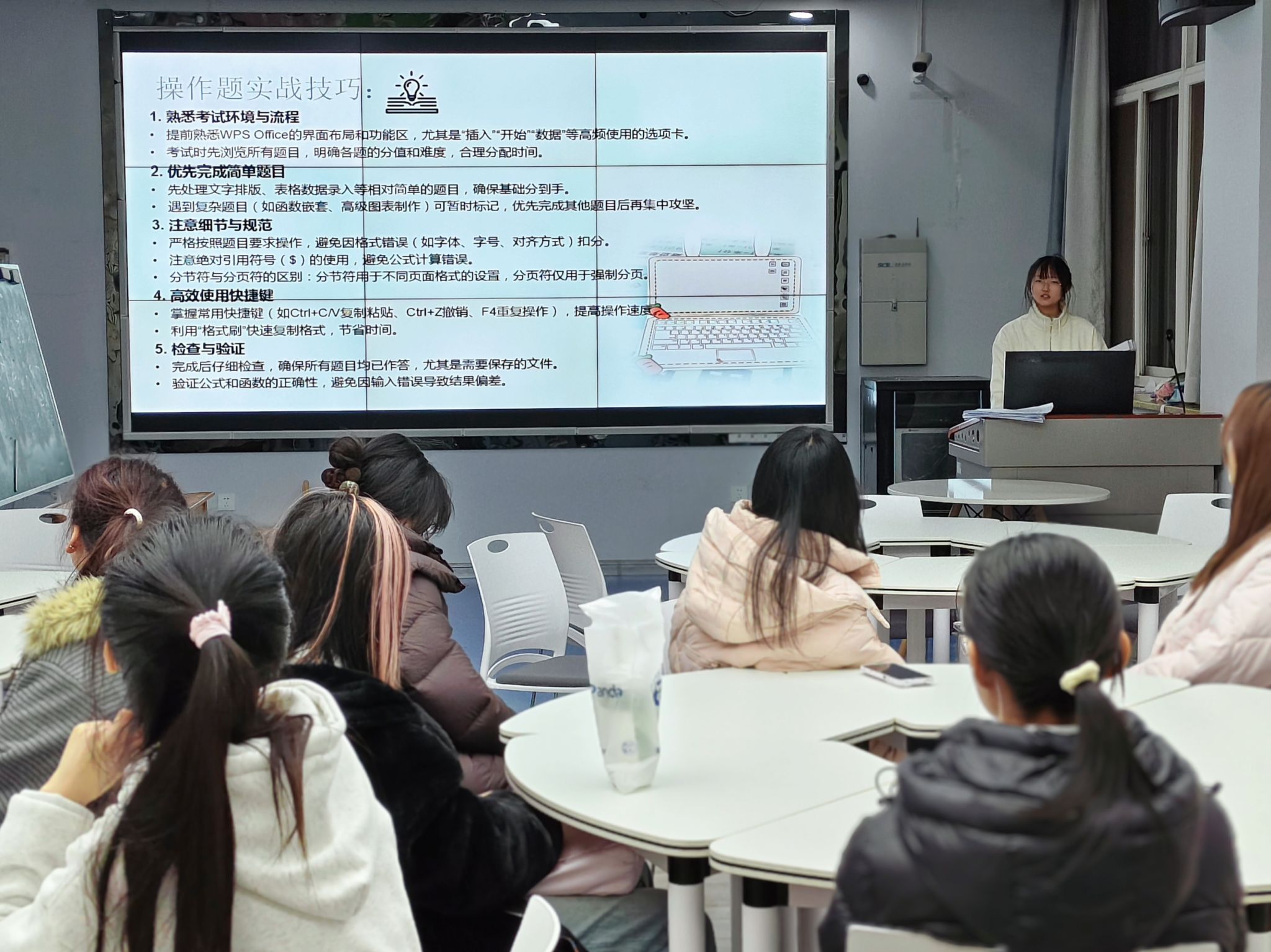 随后,她还分享了科学的备考计划与实战技巧。提出 “基础 — 强化 — 冲刺” 三阶段备考法,传授了 “熟悉环境、先易后难、注重细节、巧用快捷键” 的答题策略,提醒大家注意格式规范与文件保存,并且完整还原了考试全流程,细致讲解了每一步的关键要点与时间分配建议,帮助同学们提前熟悉考试节奏。